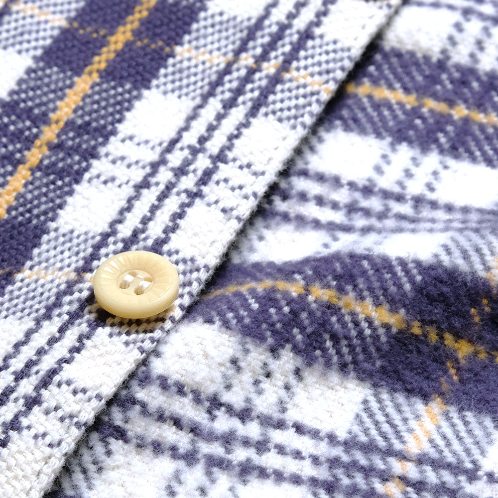 The power loom used to weave flannel shirts is the same twill weave loom used for denim. Since flannel shirts require pattern formation, the loom is designed to be able to weave multiple colored yarns. The warp yarns move up and down in a complex motion according to the design, while shuttles with different colored weft yarns continuously alternate and move back and forth between them. The flannel woven with this characteristic old-style power loom tension becomes fabric without losing the inherent unevenness of each yarn. WAREHOUSE applies a brushing process to the reverse side of the finished flannel fabric, following the manufacturing methods of the era. This brushing creates a soft expression within the pattern. Furthermore, brushing adds fullness to the fabric, making the unique texture of old-style power loom flannel even softer. Thus, WAREHOUSE flannel, woven on old-style power looms, has a unique texture born from recreating the yarns themselves. Also, just like vintage flannel shirts from around the 1960s, WAREHOUSE uses selvedge for the gusset section.