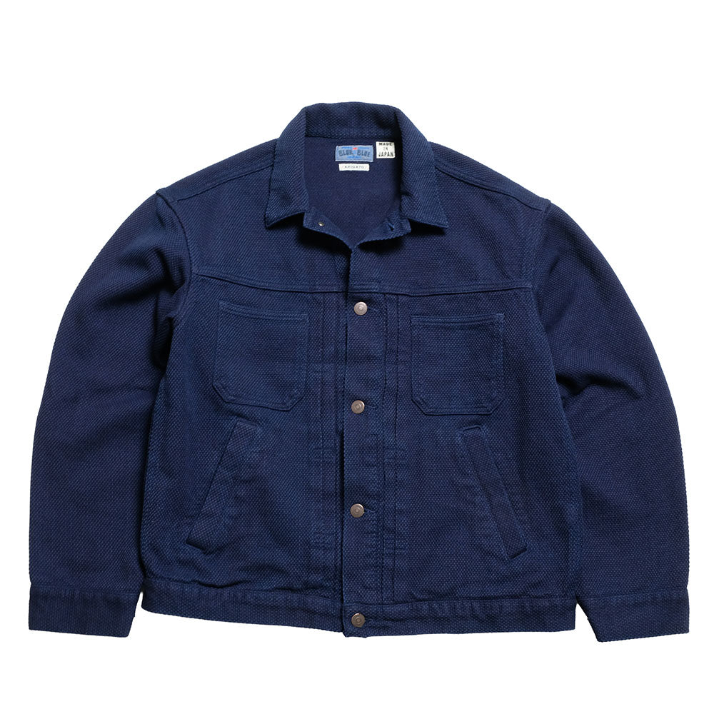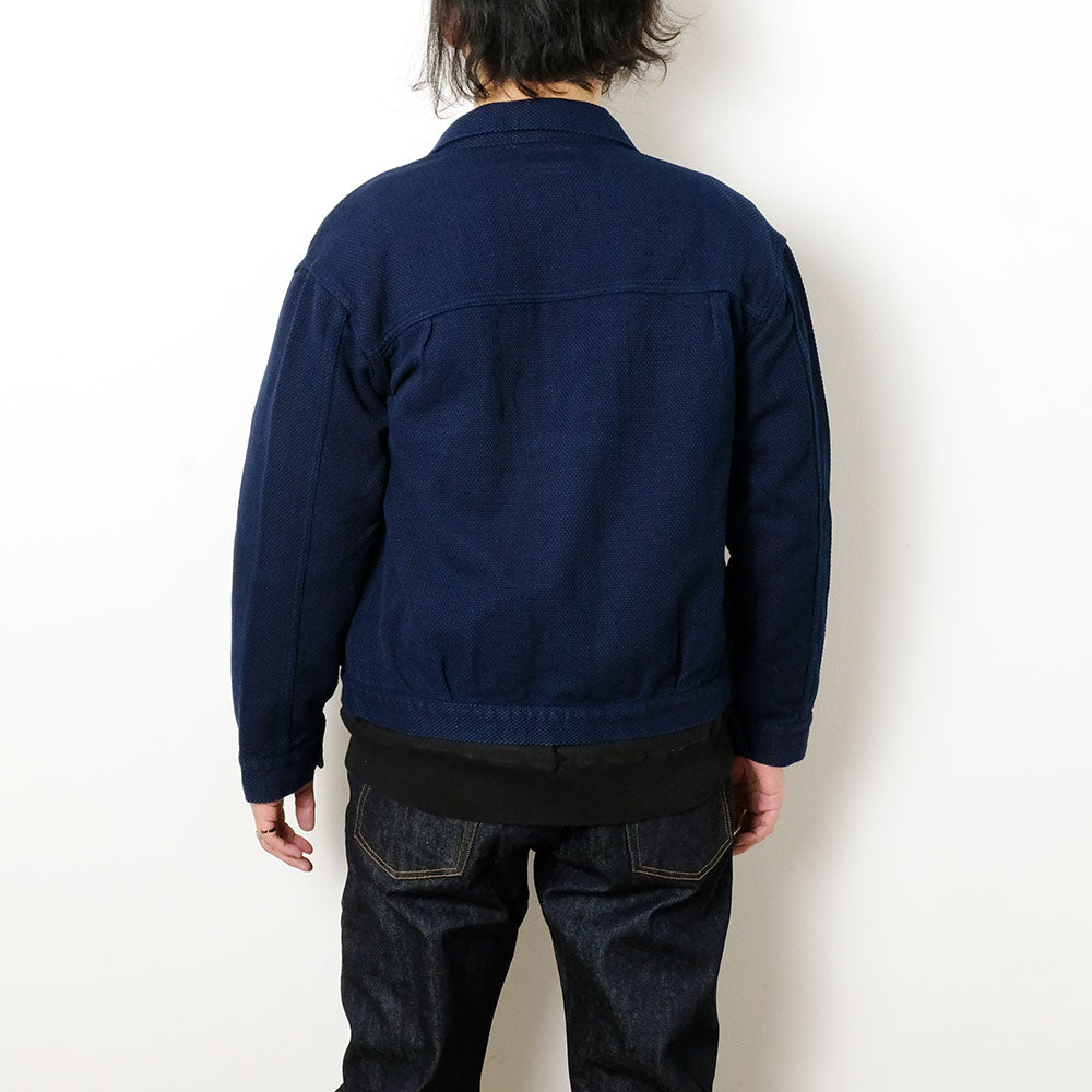 This trucker jacket is made of lightweight Sashiko fabric, featuring the brand's signature natural-indigo-dyed Sashiko material finished with adjusted weft yarns for lightness and softness.