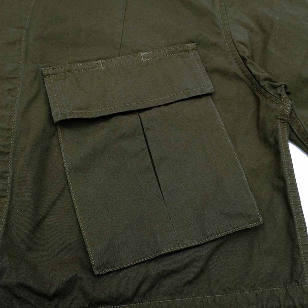 • This jacket is inspired by the late model of the U.S. Army's Jungle Fatigue Jacket with square pockets, which is rare among them. The 4-pocket style and details have been retained, and hand warmer functions have been added to the waist pockets. The drawcord on the backside allows the waist to tighten. The material is a high-density poplin made of Superior-Pima cotton. After sewing, the jacket is garment-dyed to give it a unique texture. The buttons are nut buttons. And it has a removable chin warmer on the back of the collar.