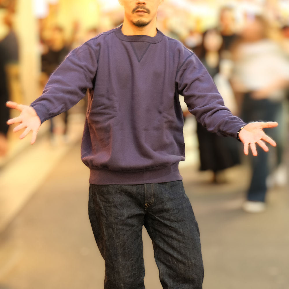We aimed not for extreme softness, but for a "sweatshirt you grow with" that develops its texture the more you wear it. It recreates vintage sweatshirt details, such as the tubular body and double V-gussets. Additionally, the armholes and length have been adjusted for a modern fit, resulting in a balanced, clean silhouette even when layered. The soft, brushed lining is perfect for keeping warm in fall and winter. It starts with a firm texture, but with each wash and wear, it molds to your body, developing into “your own unique sweatshirt” just like denim.