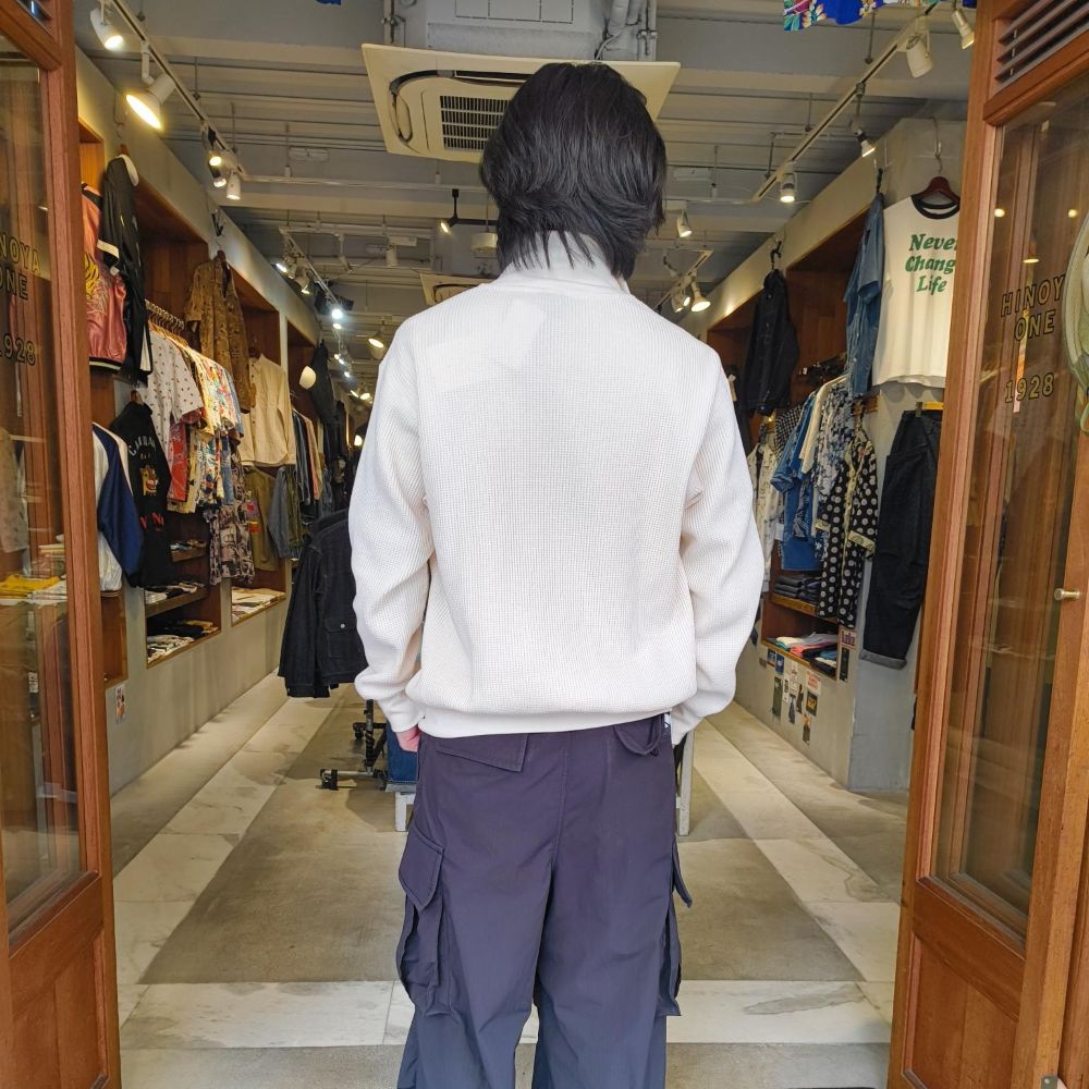 • This full-zip cardigan is made of a thick, low-gauge waffle fabric knitted using an old knitting machine. The waffle fabric is knitted in high-density from US cotton strands to reduce the negative side of waffle fabric, which usually tends to stretch easily. Designed like a track jersey, with a two-way front zip. The side panels are slightly shifted to the front with handwarmer pockets. The relaxed fit makes this a useful item not only as an inner layer, but also as a wear for early fall.