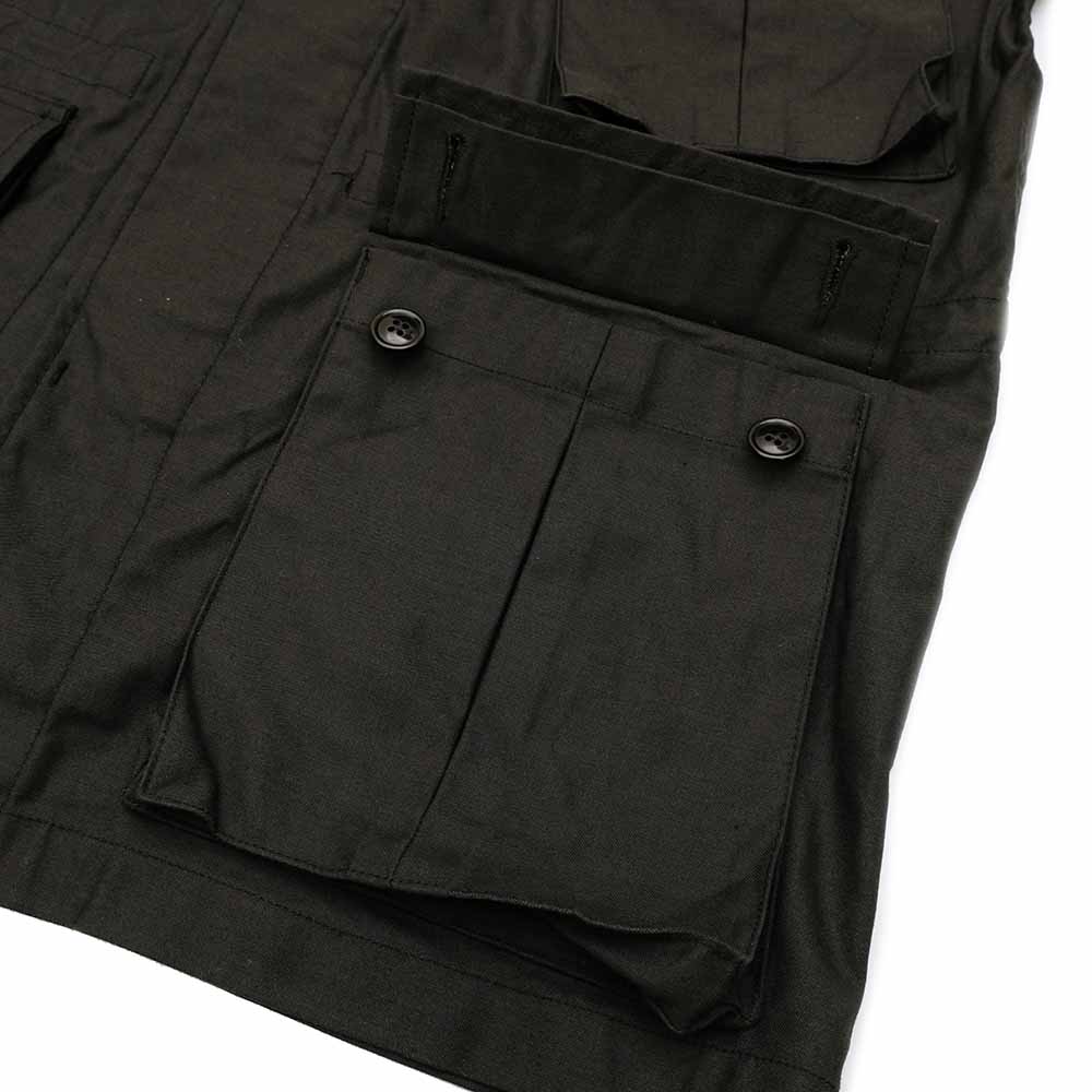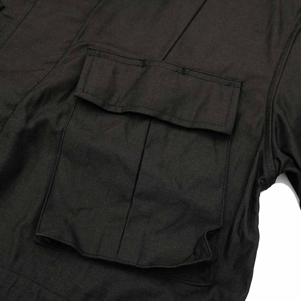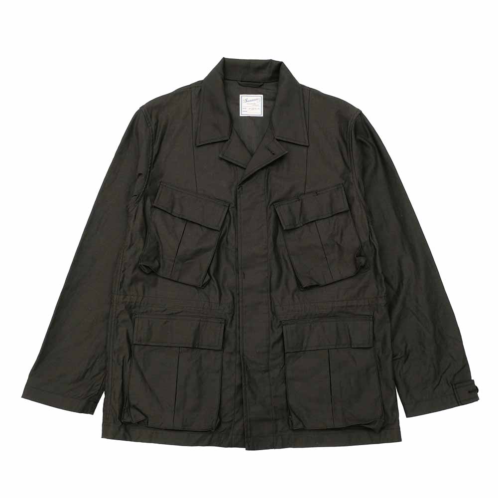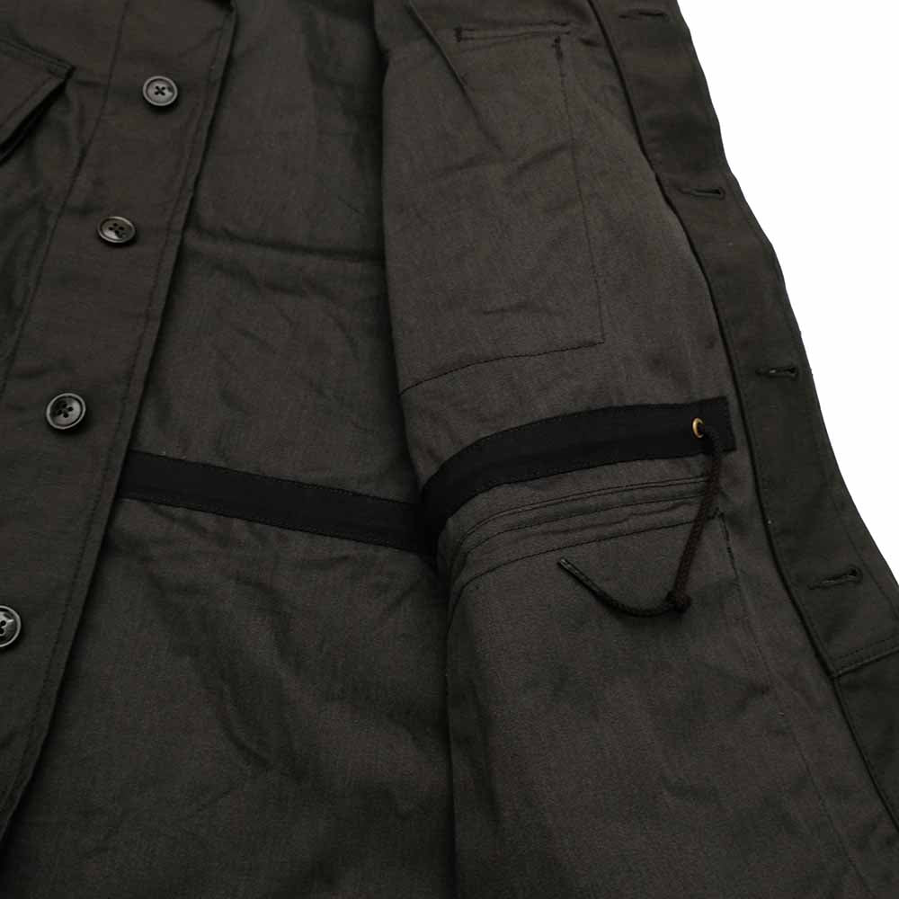 • This jacket is inspired by the later model of the U.S. Army's jungle fatigue jackets with square pockets, which are rare among the U.S. ARMY jungle fatigue jackets (they were only made for a year or two at the time, and later were replaced by the BDU Jacket). The 4 pockets and details are retained, while hand warmers are added to the waist pockets. Also, a drawcord is added to the backside of the waist to tighten the waistband. The material is back satin, woven with a cotton-nylon blended yarn in a high density. The stiffness process gives it more resilience than normal back satin. Buttons are nut buttons and a removable chin warmer is provided on the back of the collar.