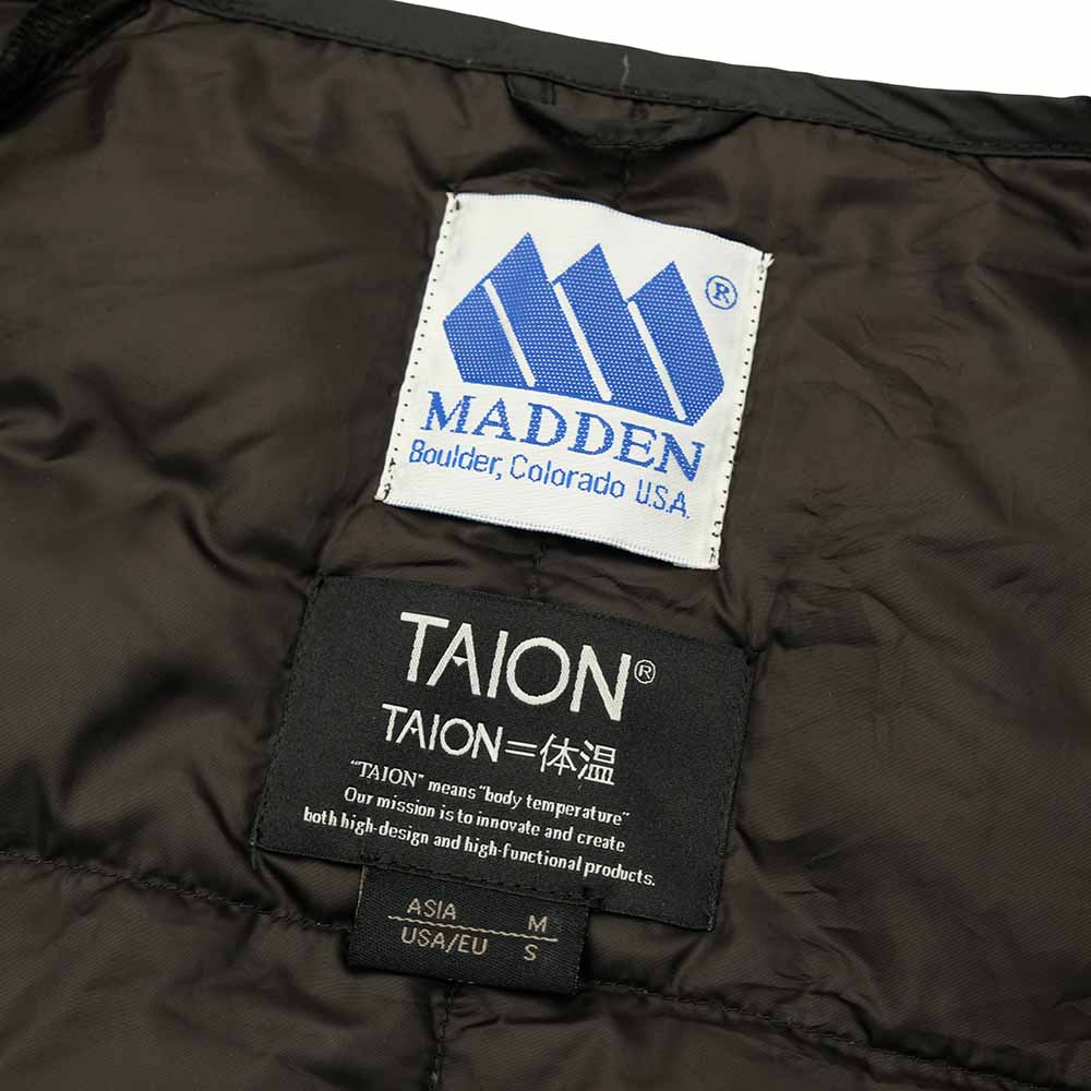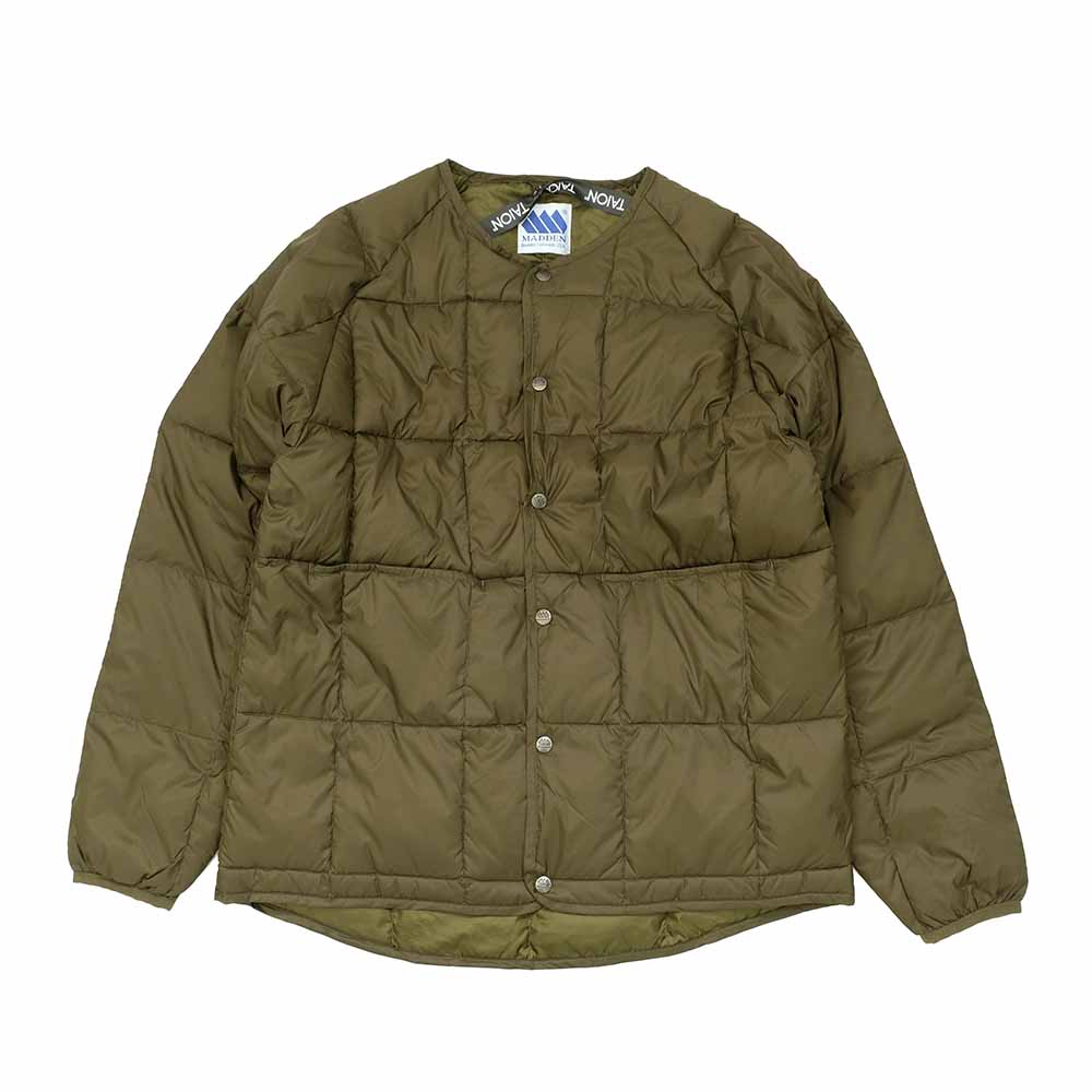 • This inner cardigan is a collaboration item between "TAION" and "MADDEN". The collar has a clean crew neck specification, and snap buttons are used on the front. It has a simple design such as larger quilting and slightly larger pockets on the front. The origin of the brand name "TAION" means body temperature in Japanese. The brand pursues value through overwhelming cost performance and offers a wide range of high-quality, high-function inner downs. "MADDEN" inherits the experience and techniques cultivated in "Colorado" and aims to create outdoor products that are simple, durable, and last longer than any other products.