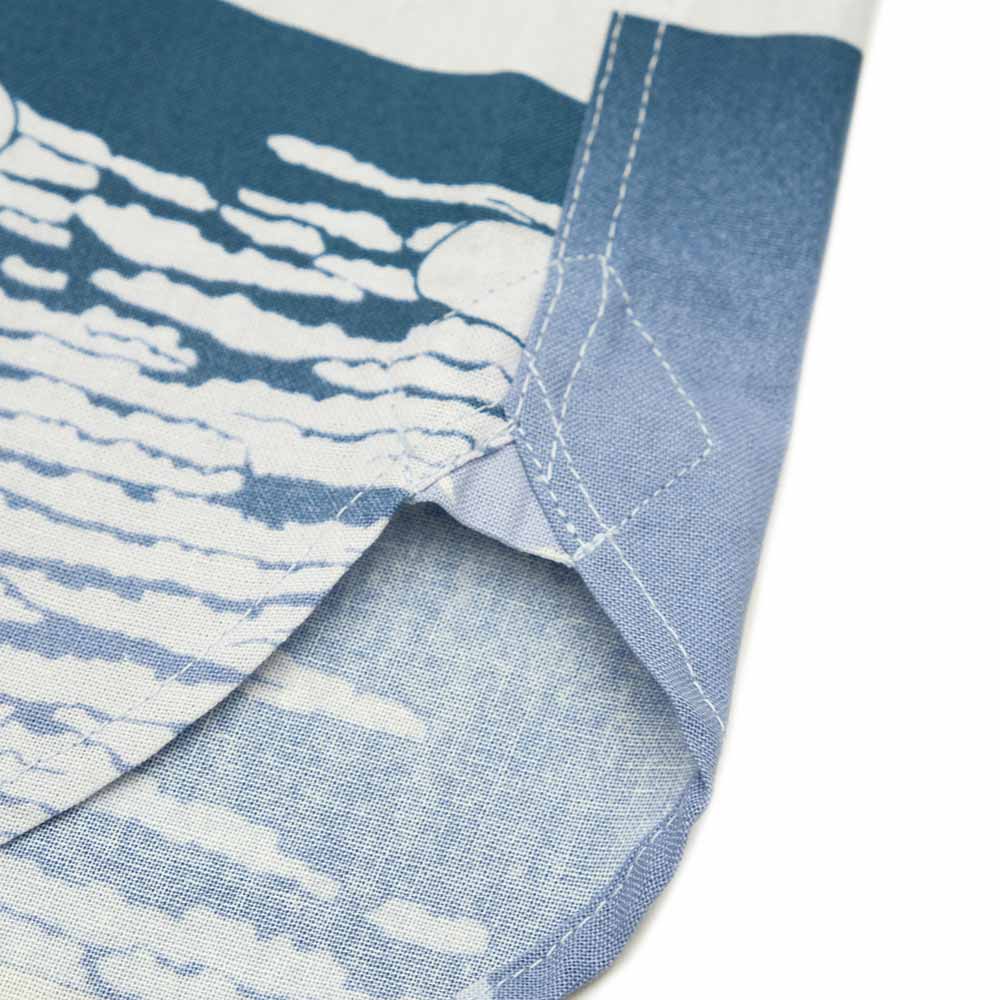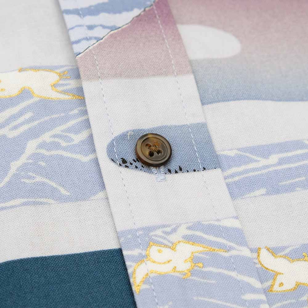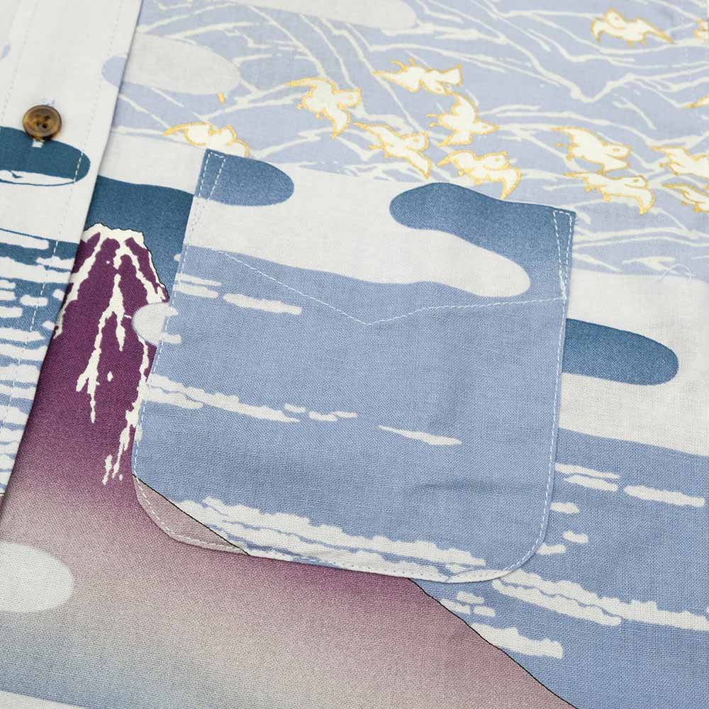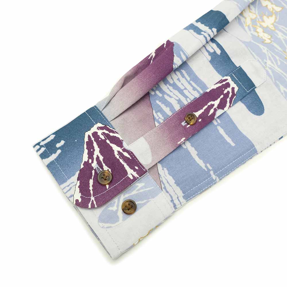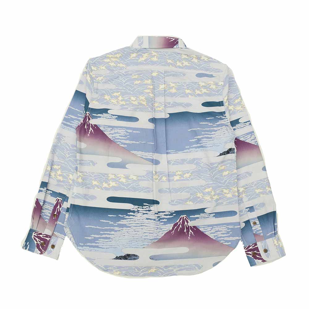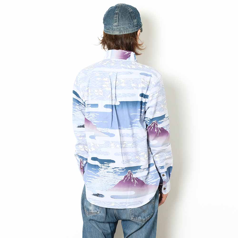• "KOROMO ZAKURA" focuses on traditional Japanese design. This long-sleeved regular shirt, “Red Mt.Fuji", is made of a slightly thicker but smooth-to-the-touch sheeting cloth. The Japanese design with an oriental feel, "the Japanese landscape with Red Mt. Fuji, is depicted all over the shirt. It is a long-sleeve regular shirt with a clean silhouette. It is a versatile item that can be worn by itself or layered with a vest, jacket, or other garments.