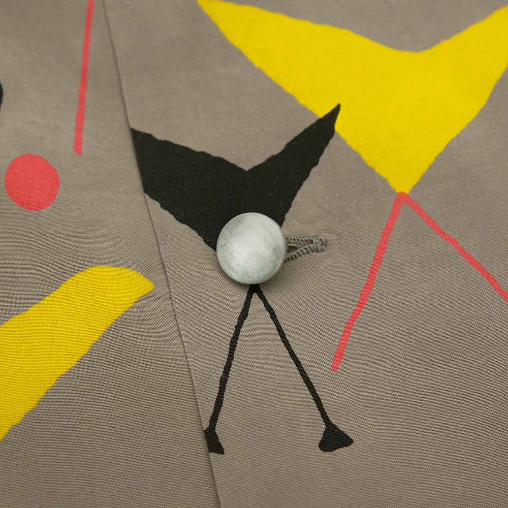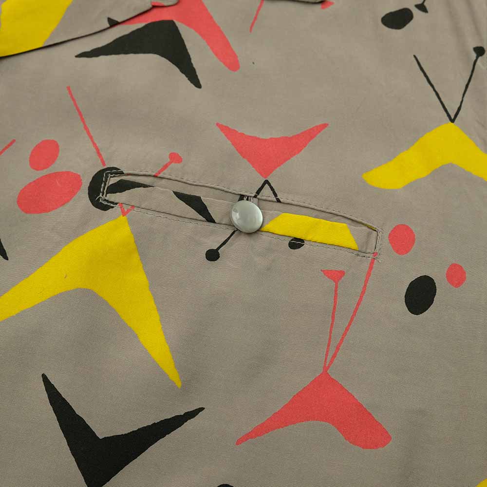 • STAR OF HOLLYWOOD has reproduced this shirt based on vintage. This modern atomic pattern combines motifs that look like boomerangs or mid-century chairs with distorted dots. In the 1950s, this kind of abstract style, called "atomic," was popular among artists. Atomic patterns can be seen on curtains, lampshades, and other fabrics of the time, but vintage men's shirts are extremely rare and highly valued in the vintage market for their artistic design.
