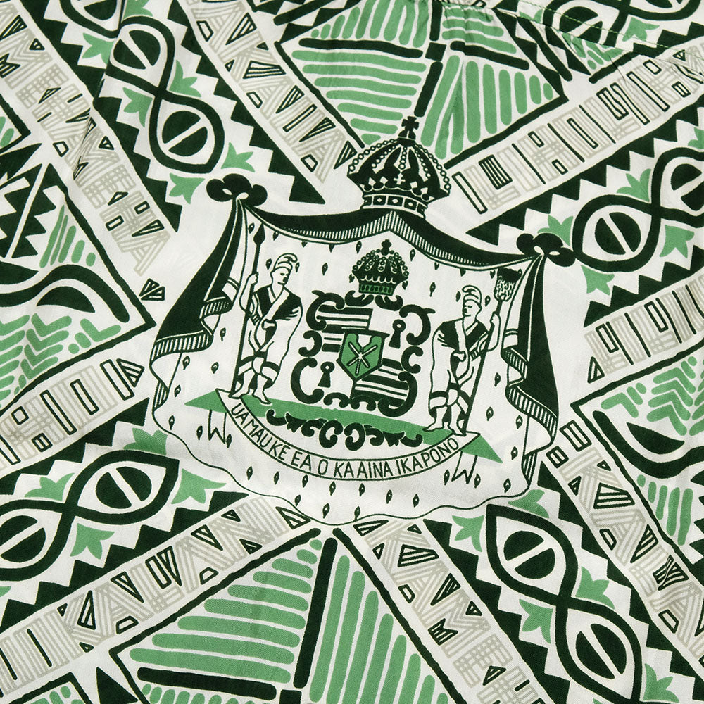 • This work is named “Hawaiian Monarch” (Hawaiian Royalty). In the Hawaiian crest (the crest of the Hawaiian Kingdom) placed throughout the shirt as the main motif and the tapa pattern (a traditional Polynesian design) of the ground, if you look closely, you can see the names of royalty such as Kamehameha, Kalakaua, and Liliuokalani inscribed, making this Aloha shirt of great historical value. This version, composed of similar colors, is based on a newly discovered vintage shirt, and even SUNSURF has reproduced it for the first time.