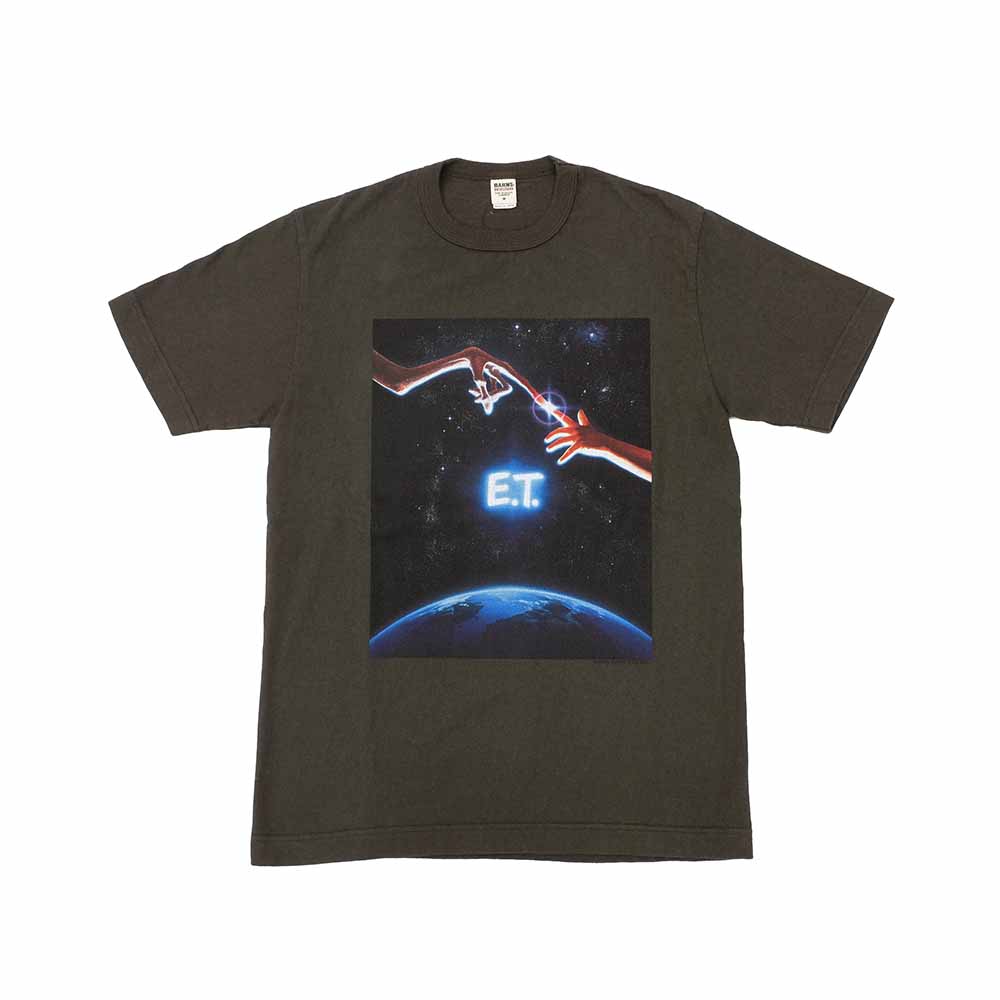 • "BARNS" products with the concept, "quality is more important than efficiency", are somewhat warm. This T-shirt is made with "BARNS" original body, which is made slowly over time using a valuable loop-wheeled knitting machine from the Taisho era. The fabric is knitted with air over time, making it soft and comfortable to wear. This T-shirt features an inkjet print of a scene from Steven Spielberg's masterpiece E.T." on the front.