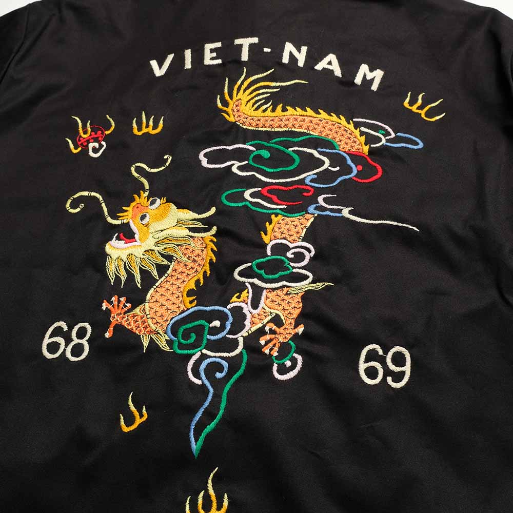 • 1960年代後期(1968〜69年)にベトナムへ駐留していた米兵がオーダーし、アメリカへ持ち帰った一着。マップ柄が主流のベトジャンにおいて、このドラゴンの刺繍は非常に希少である。龍柄のヴィンテージはいくつか確認されているが、これほどカラフルで迫力のある刺繍は他に類を見ない。背中の龍も袖の龍も多色の色糸を駆使して描写されており、当時も高い技術を持つ職人が手掛けていたことが窺える。左胸の「福」の文字は通常よりもやや小さいが、2色の色糸を使いヴィンテージに準じたバランスで再現している。