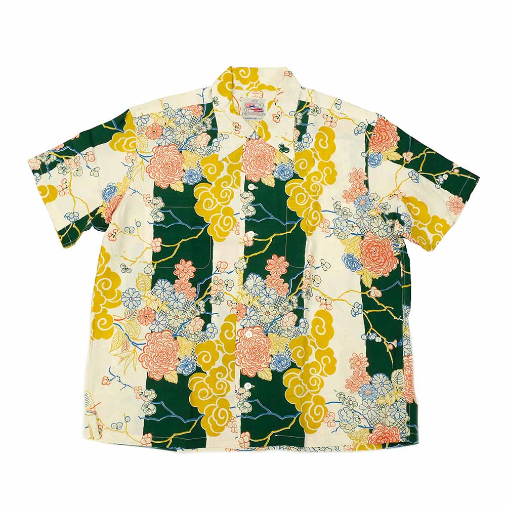 • 菊などのオリエンタルなイメージの花で構成されたデューク・ブランドの中でも非常に異色で珍しいデザイン。ボーダー状の柄をベースとして、その上にデフォルメして描かれた花、さらに雲など柄のアクセントとなるモチーフが独特のタッチで表現されている。アメリカ本土の流行を常に意識し、柄のデザインや色使いにもそれらの流れを取り入れていたデューク・ブランドらしさが表れたオリエンタル・デザイン。