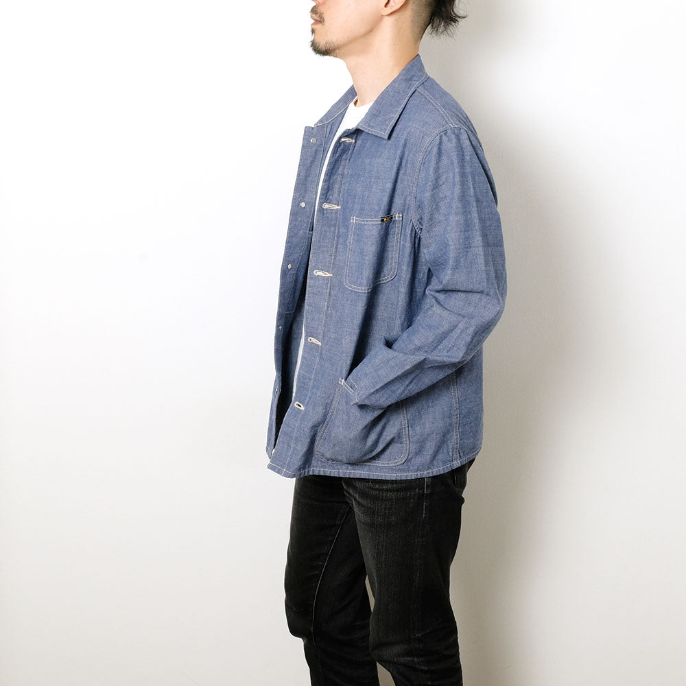 • 8オンスのセルヴィッジ シャンブレーを使ったカバーオール。旧式の力織機を使うことにより、まるでヴィンテージシャンブレーのような凹凸が特徴の生地感。デニムなどと比べると薄い生地ですが、しっかりとしたコシのある質感が特徴です。袖口はカフスがない、ヴィンテージワークジャケットのようなデザイン。