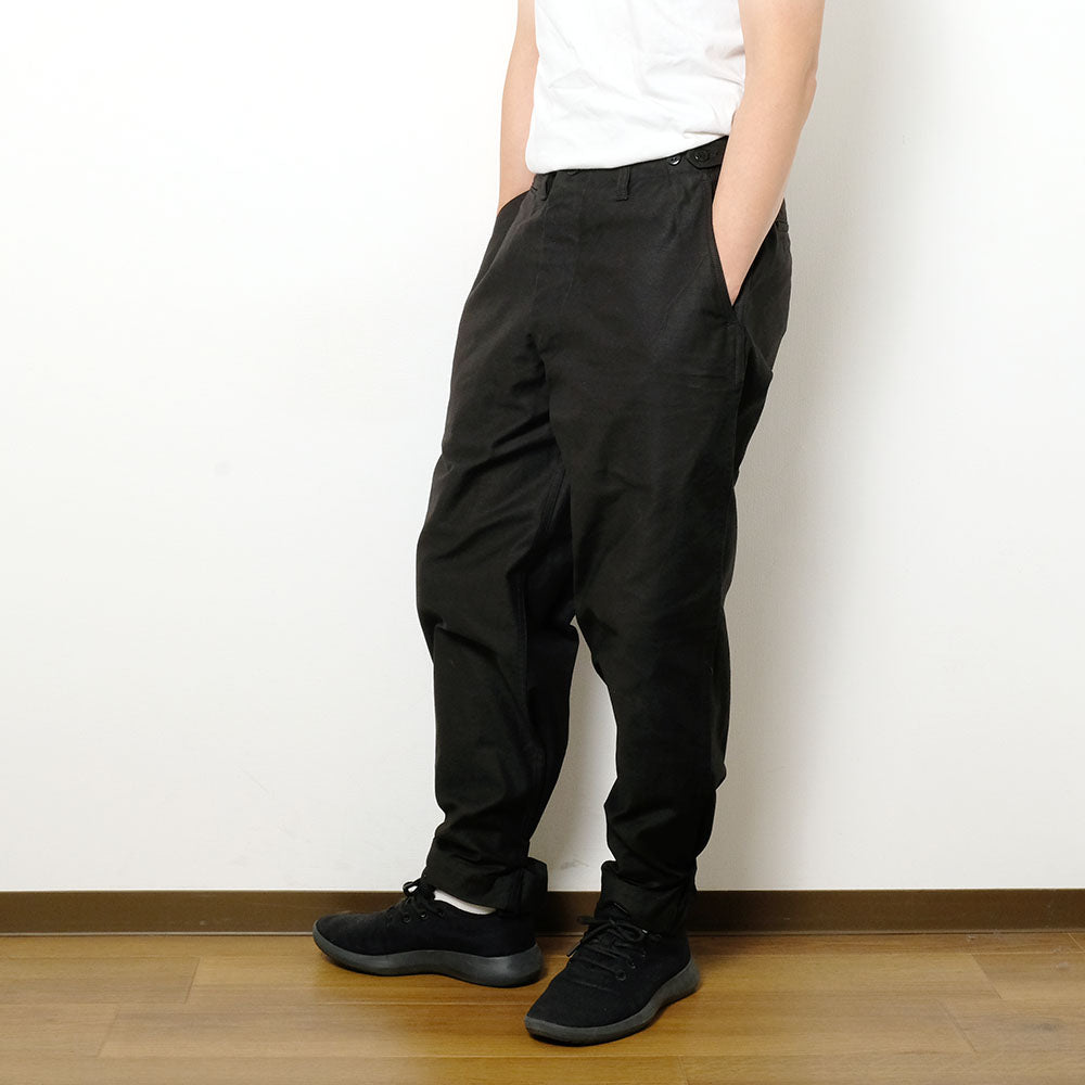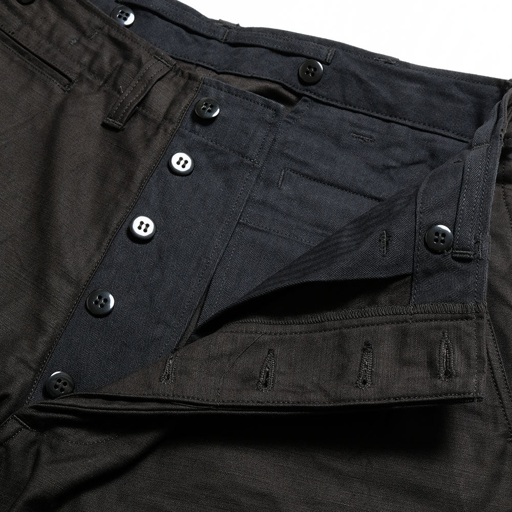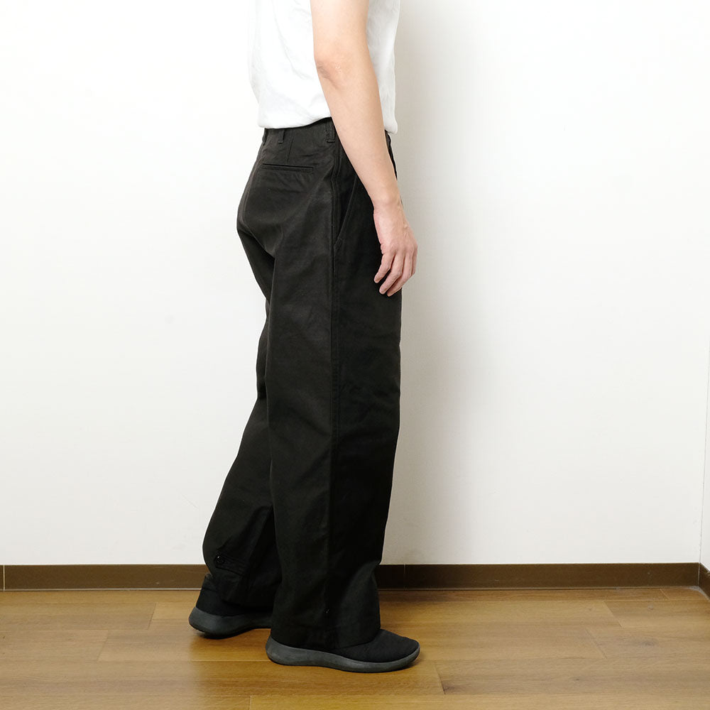 • 米陸軍はM-43フィールドジャケットの導入に伴い、セットアップで着用するトラウザースを採用した。ウエスト周りにはサイズ調節可能なタブが付き、ベルトループとサスペンダー用のボタンが設置され、着用の方法を選べる凝った仕様を持っているのが特徴。