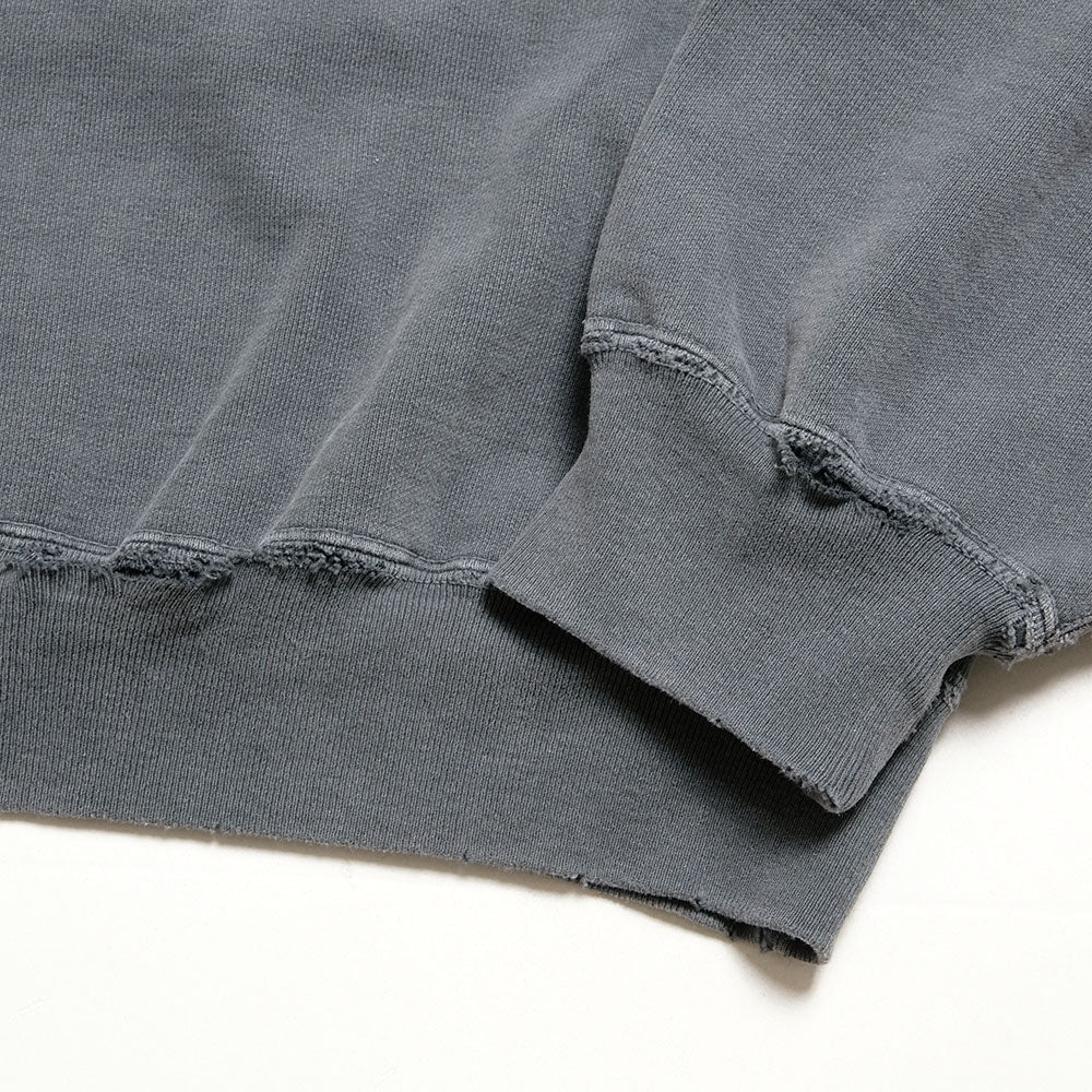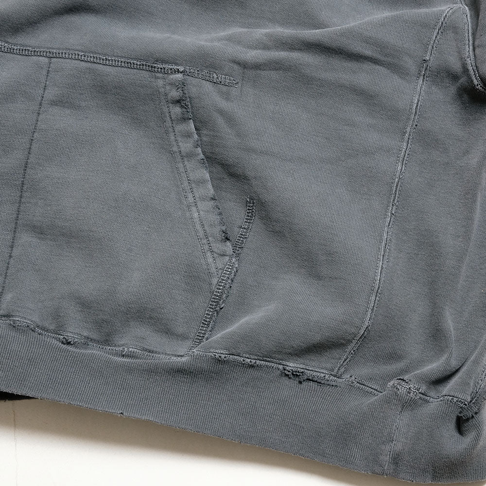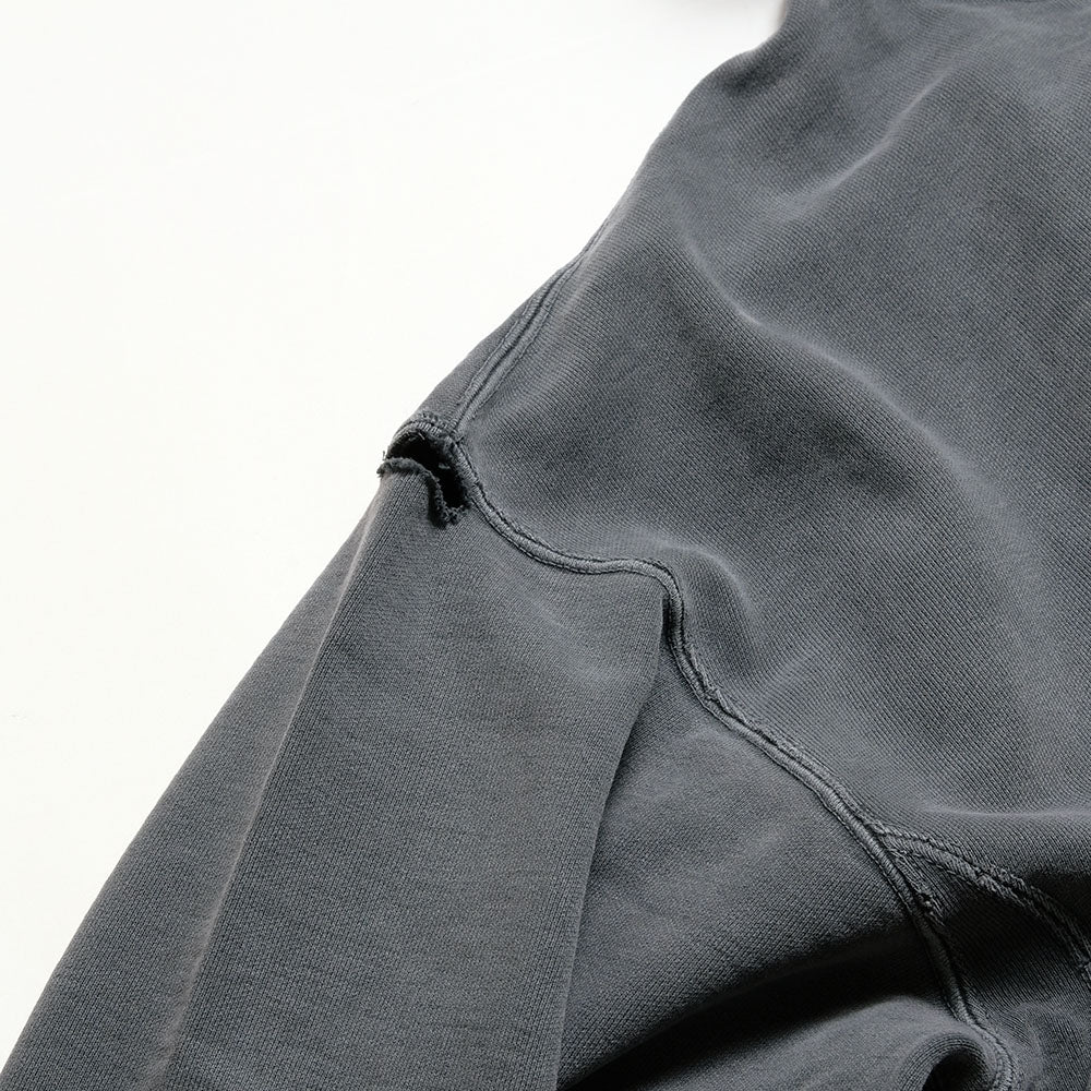• まるで長年着込んだかのような経年変化を忠実に再現したスウェットパーカー。レミレリーフのSP加工とは、1930年代から60年代後半のスウェットに使用されていた直接染料や硫化染料の退色プロセスを再現した技法。今回の加工はさらに2倍の時間をかけ、職人が1点1点製品を入念にチェックしながら調整。ヴィンテージスウェットが持つリアルな雰囲気を出すため、計算されたクラッシュディテールを施しています。生地に使用している糸は、アメリカはニューメキシコ州内のアルバレス農場で栽培されたオーガニックコットンの「落ち綿」を採用。ゲージギリギリで編み立てとても度の詰まった硬い裏毛はハードな加工を施してもコシとハリが損なわれません。裏毛はパイル仕立てとなり、真夏以外使いやすいドライな着用感です。シルエットはゆったりとしたリラックスフィット。肩幅もたっぷりと取られたボックス型のシルエットです。