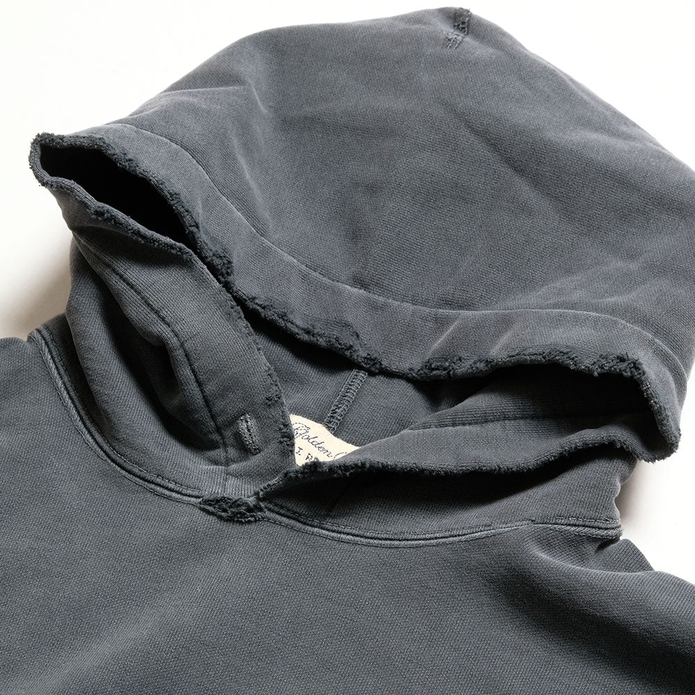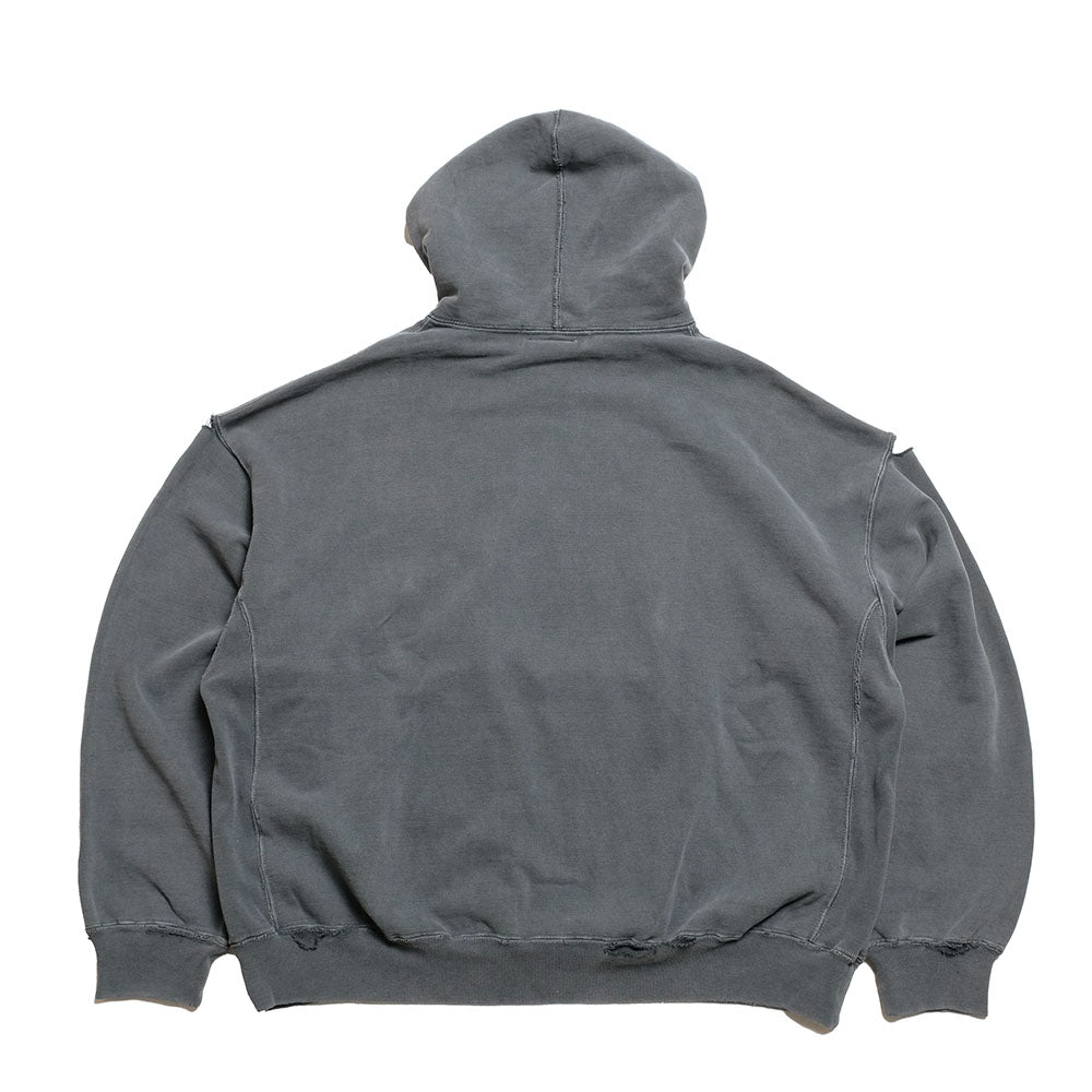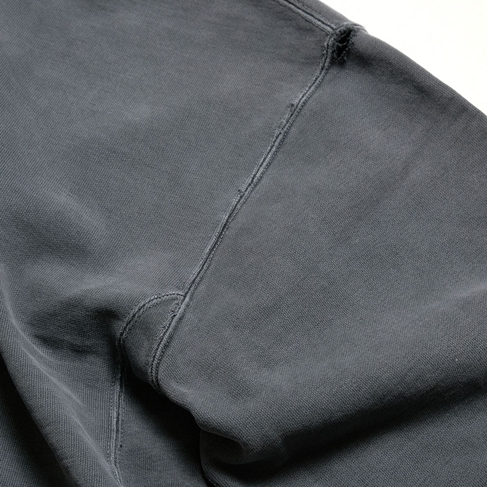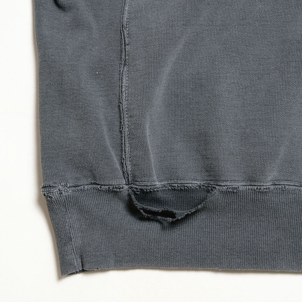 • まるで長年着込んだかのような経年変化を忠実に再現したスウェットパーカー。レミレリーフのSP加工とは、1930年代から60年代後半のスウェットに使用されていた直接染料や硫化染料の退色プロセスを再現した技法。今回の加工はさらに2倍の時間をかけ、職人が1点1点製品を入念にチェックしながら調整。ヴィンテージスウェットが持つリアルな雰囲気を出すため、計算されたクラッシュディテールを施しています。生地に使用している糸は、アメリカはニューメキシコ州内のアルバレス農場で栽培されたオーガニックコットンの「落ち綿」を採用。ゲージギリギリで編み立てとても度の詰まった硬い裏毛はハードな加工を施してもコシとハリが損なわれません。裏毛はパイル仕立てとなり、真夏以外使いやすいドライな着用感です。シルエットはゆったりとしたリラックスフィット。肩幅もたっぷりと取られたボックス型のシルエットです。