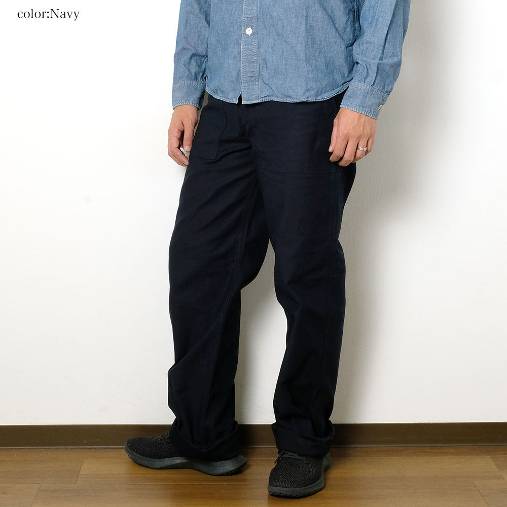 • 軍隊における作業用として用いられていたファティーグパンツは、無駄な装もなく極めてシンプルなディティールが特徴。それゆえに、どのようなコーディネートにも応えられる万能アイテムの一つです。 今回BURGUS PLUSが作り出したものは、ミリタリーテイストの強いバックサテン地。 しっかりとした高密度のコットンサテンは、うっすらと光沢感を湛えて上品さを感じるほど。ステッチワークはボディーと同系色でまとめ上げ、ボタンも黒のメタルボタンを採用し調和が取れたディティールに仕上げております。シルエットは股上も深く、ゆったりとしたデザイン。ミリタリーらしい無骨さは残しつつ、ミニマムなテイストは一年を通してあらゆるシチュエーションで活躍するはずです。