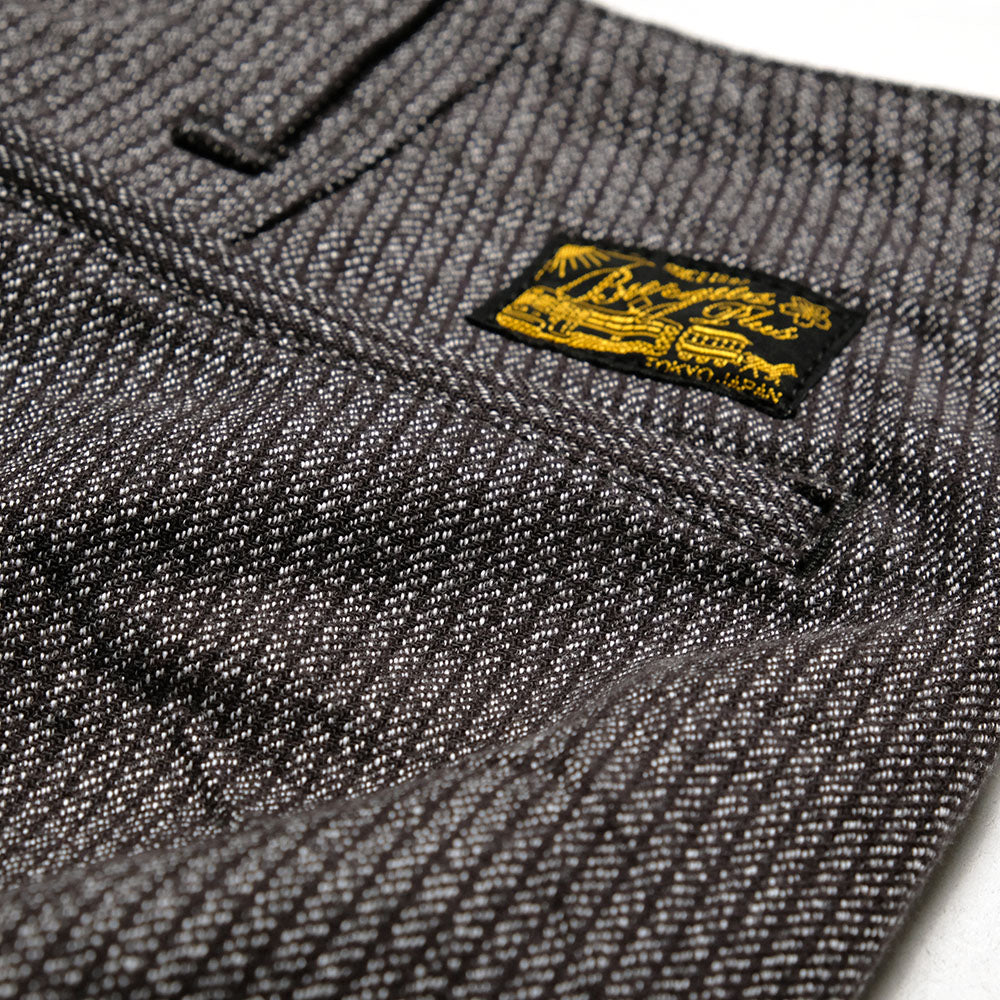 〈BURGUS PLUS(バーガスプラス)〉Lot.401Z ストライプ コバート トラウザーズ。古いワークウェアに使われてきた“コバート生地”を、現代的な解釈で深化させた一本。汚れが目立ちにくいという機能性を持つコバートの発想を、杢ストライプという手法で再構築しています。