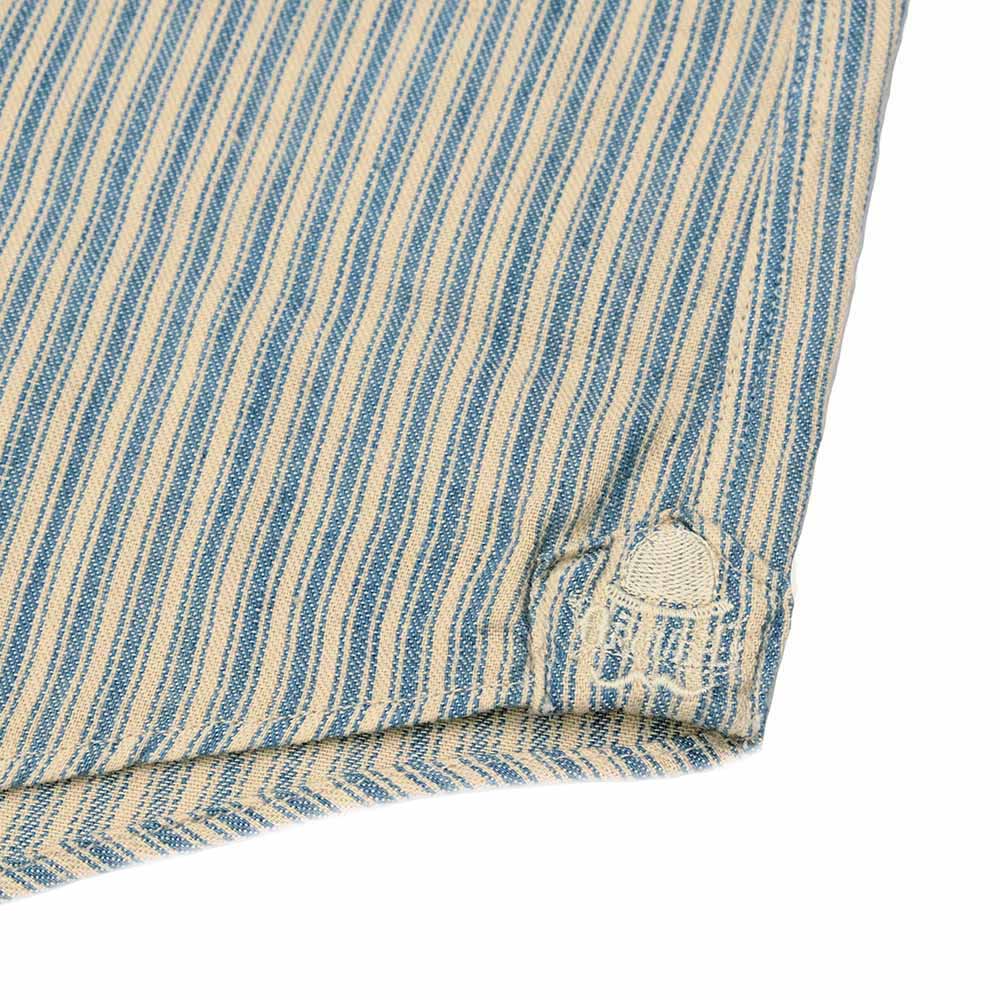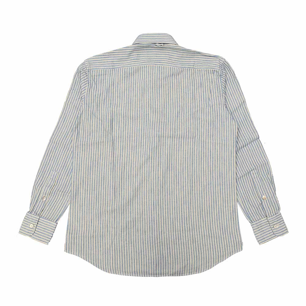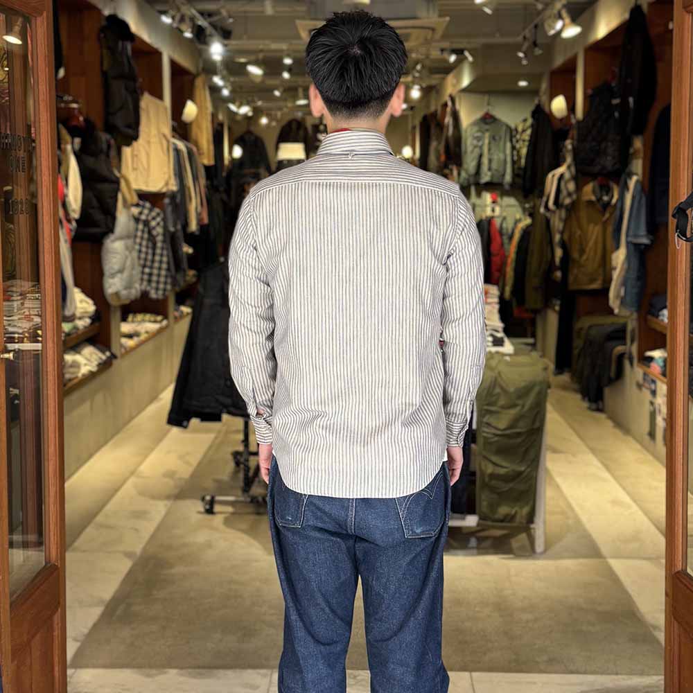 • クラシカルな印象のストライプ柄はインディゴ染めした糸を使用しており、淡く清涼感がありながら、独特の風合いを醸し出しています。インディゴ特有の風合いはもちろん、ヴィンテージのような雰囲気も楽しめる生地で仕上げております。ワイドスプレッドカラーとも言われるウィンザーカラーは襟が大きく拡がっているのが特徴で、ウィンザーカラーの名称はイギリス国王・エドワード8世に由来しています。存在感のある襟と大きく拡がった襟元が独特の雰囲気を醸し出し、20世紀前半のクラシカルなイメージを彷彿させます。また、首裏にはハンガーループが付属し、ヴィンテージのシャツに見られるディテールで、フックなどにそのままシャツをかける為の部分です。裾のサイド部分にはベース型の補強を施しており、オルゲイユを象徴するボーラーハットがアクセントとなっております。ボタンには天然のシェルボタンを採用し高級感があり、クラシカルな雰囲気も持つボタンとなっています。胸ポケットは角に丸みを持たせ、優しい印象に仕上げています。
