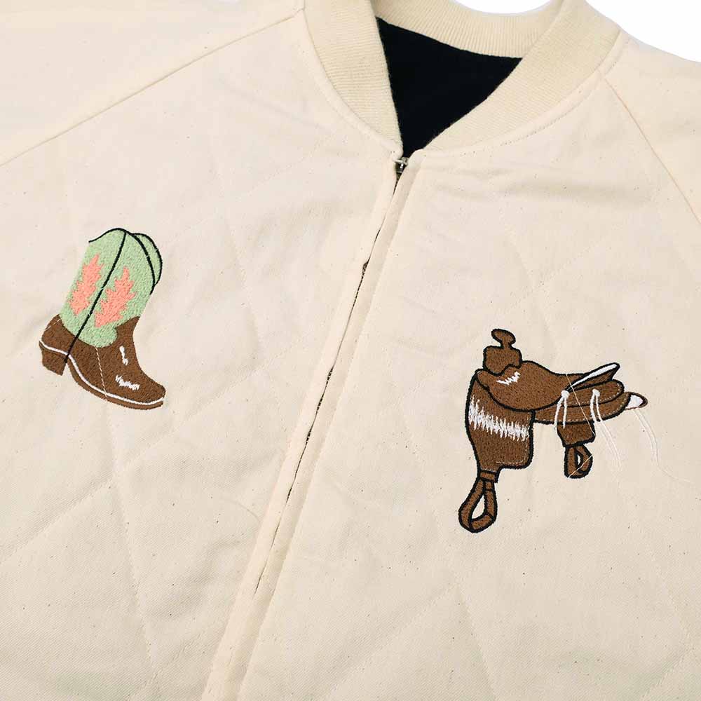• 今回はWESTOVERALLSからDENIM SOUVENR JACKETの登場です。桐生市発祥のこの伝統を伝える桐生ジャンパー研究所に依頼して当時のヴィンテージ刺繍の型を使用し歴史を繋ぐスーベニアジャケットを8ozライトオンスデニムを採用し製作。伝統的な横振り技法で刺繍を施したり、キルトステッチ、コード、リブに至るまで、当時のヴィンテージを解析し、後世に残したい技術をふんだんに取り入れた一着が完成。60gの中綿入りのため、保温性にも優れています。