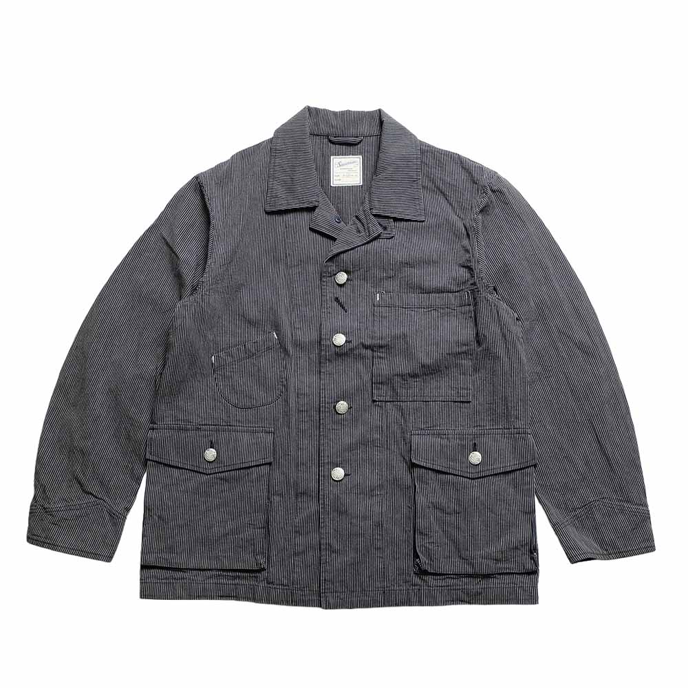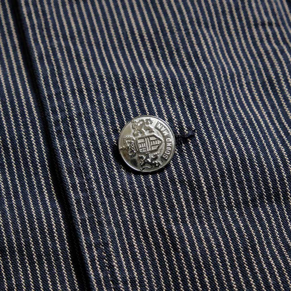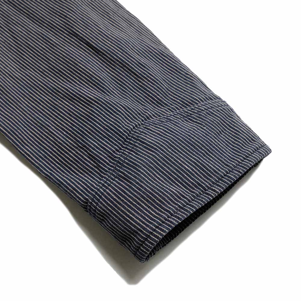 • D型のチェンジポケットが特徴的なディティールである1970’sの日本の国鉄ユニフォーム をモチーフにリデザインしたレイルロードジャケット。チンストラップ付きのオープンカラー マチ付きの腰ポケットなど別のワークウエアのディティールを融合させた。力織機で織られたセルビッジインディゴヒッコリーを使用。経年変化も楽しみな一着。